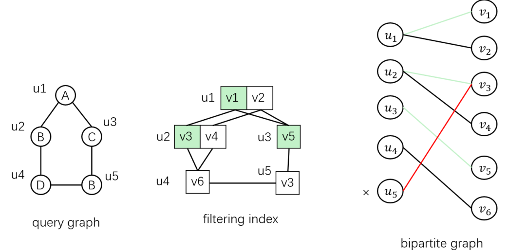 不难看出,当子图匹配存在时二分图的最大匹配的大小要等于 Q 的节点数。因为该子图匹配对应了一个二分图的最大匹配。基于这样的思路, BICE 在搜索过程通过二分图进行剪枝。继续上图的例子,假设搜索顺序为 u1,u2,u3,u4,u5,当我们搜索到部分匹配 {v1,v3,v5} 时,由于 u1,u2,u3 的取值固定了,因此我们在二分图中固定它们匹配边。我们用绿色表示这样的匹配边,此时我们只需要看 u4 和 u5 能否得到匹配。然而,u5 唯一的可能匹配节点 v3 被u2 占用了。因此,这个部分匹配不可能拓展成完整的匹配,该分支就可以被剪掉了。
