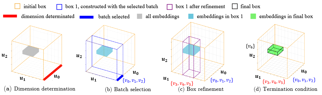 BSX 通过几何的思想将 Box 映射到高维空间中,并在这种语义下设计了搜索流程。下图是 BSX 的搜索流程。初始化时,BSX 将 filter 的结果作为初始的 box。在每次递归时,BSX 会选取 box 中一个没有正交的维度,然后从中抽取出一个正交的子集,作为新的 box。接着,子集抽取可能会导致相邻的维度的候选集的不再满足候选集的条件。因此,BSX 进行了过滤,删除了不合法的候选节点。重复以上步骤,直到 box 的每一维都正交。
