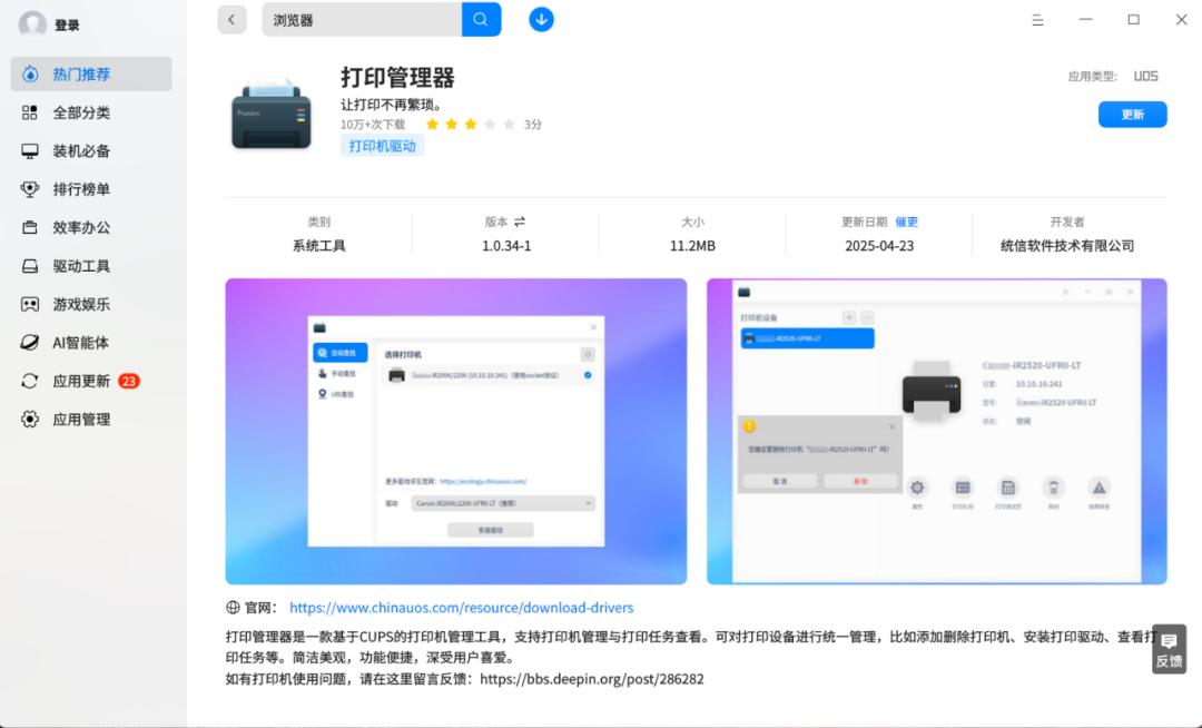 为解决此问题,统信软件正式推出全新驱动下载平台,并升级了打印管理器,目前已正式上架统信应用商店。重点扩展驱动覆盖范围,优化跨平台兼容性,并深度支持 IPv6 协议,确保在多场景下能快速获取适配驱动,享受稳定、高效的打印体验。