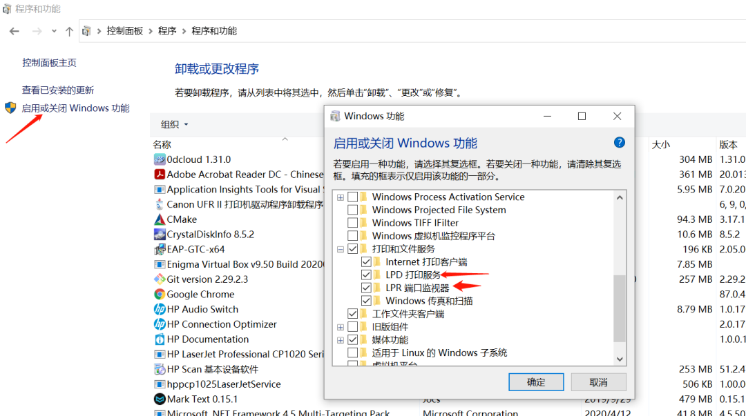 Step 2:启用 Windows 的 LPD 设置,勾选 LPD 和 LPR 选项。
