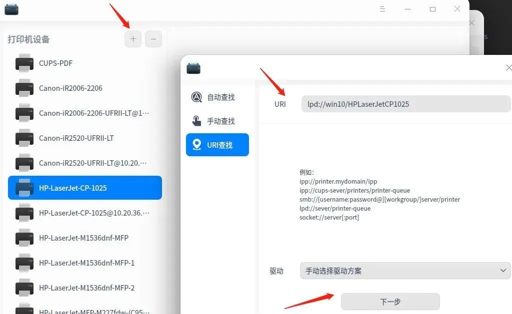 首先填写 URI,LPD 协议的打印机 URI 构成如下:lpd://host/printername。