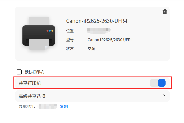 Step 1:在统信 UOS 设备上打开指定的打印机共享开关,统信软件打印管理器最新版支持「一键共享」。