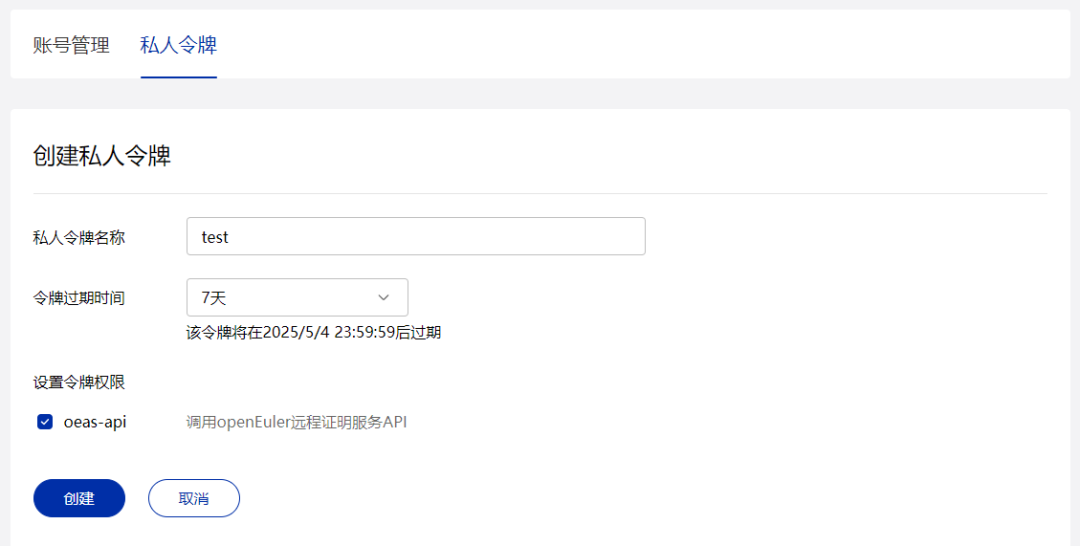 openEuler社区账号服务平台(https://id.openeuler.org/login)现已正式上线私人令牌功能。用户可通过社区平台个人中心直接生成和管理私人令牌,用于调用社区开放API,实现更细粒度的访问控制。该功能现已优先支持远程证明服务API,提供机密计算的远程验证能力。