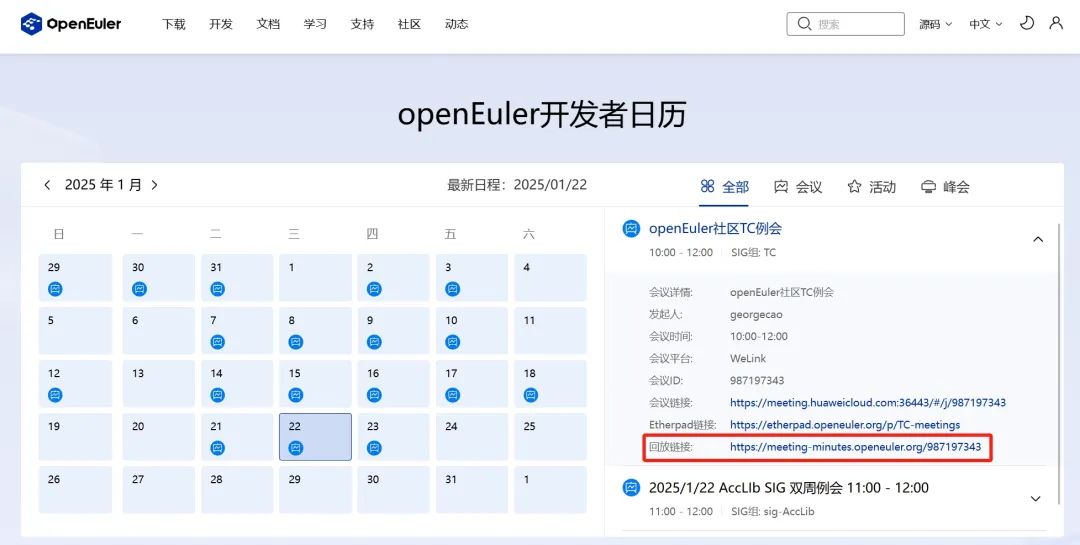 开发者可在「openEuler开发者日历」查看会议回放,如下图TC会议: