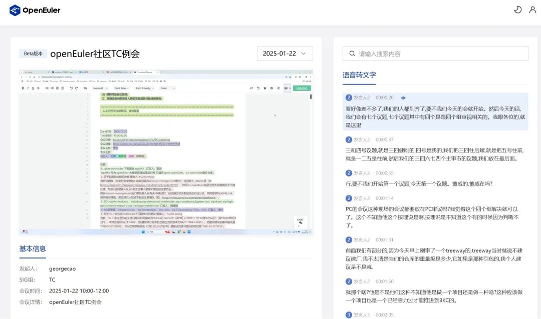 openEuler社区推出智能会议视频回放服务。开发者只需通过 “openEuler小程序” 预定线上会议,并开启 “录制” 功能,在会议结束后的 24小时内,系统将自动生成回放链接。视频回放服务还支持关键词定位,帮助开发者快速跳转到视频中的关键内容,大幅提升信息获取效率。