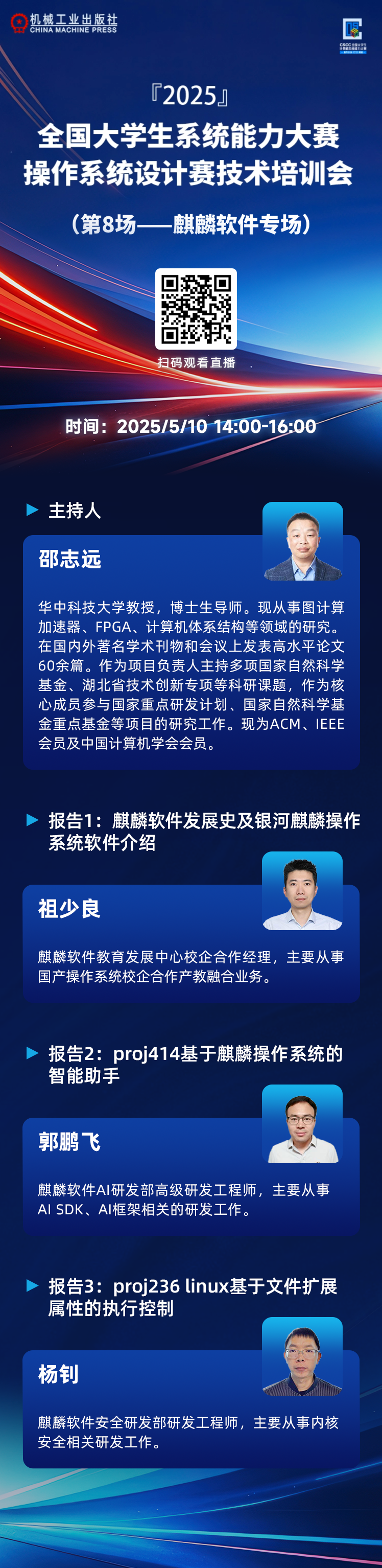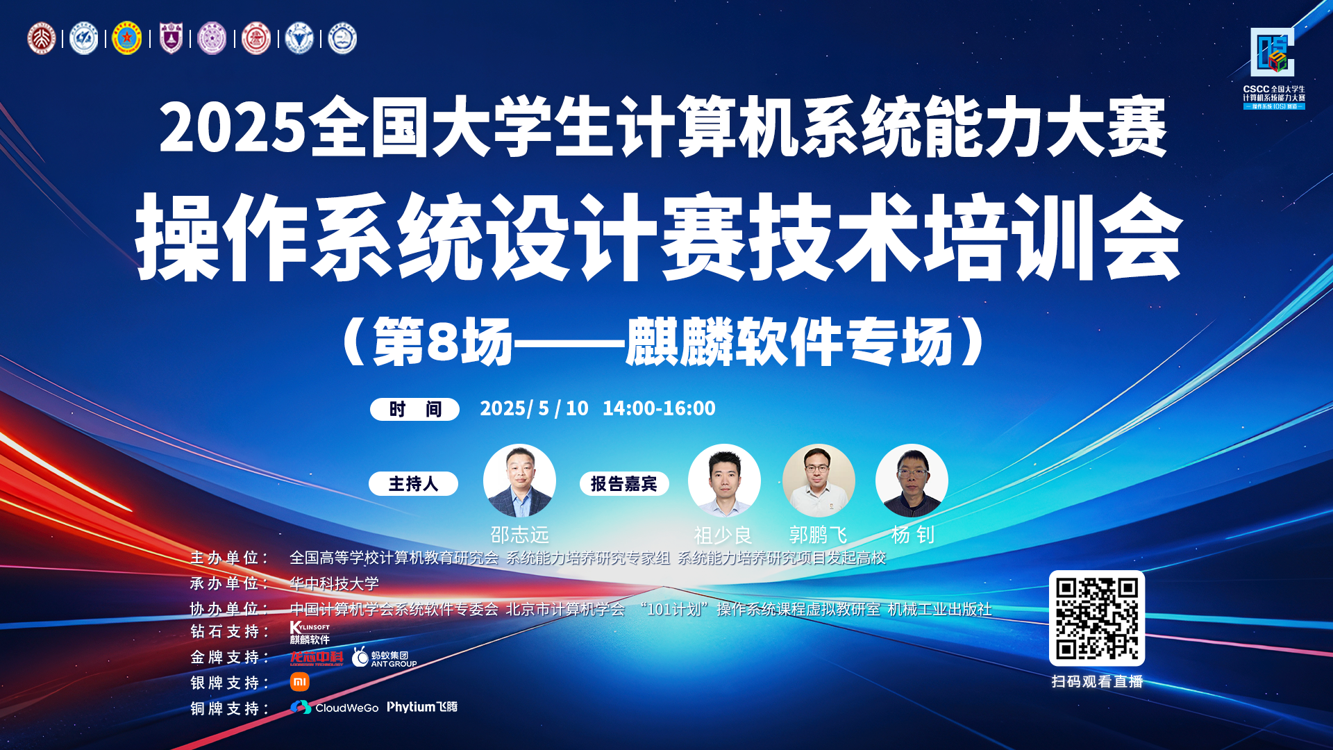 全国大学生注意啦!2025全国大学生计算机系统能力大赛操作系统设计赛(以下简称“操作系统设计赛”)已开赛,麒麟软件赛题已上线。5月10日14:00,麒麟软件专场技术培训会开启现场直播,针对赛题进行技术指导,助力同学们能够赛出水平!