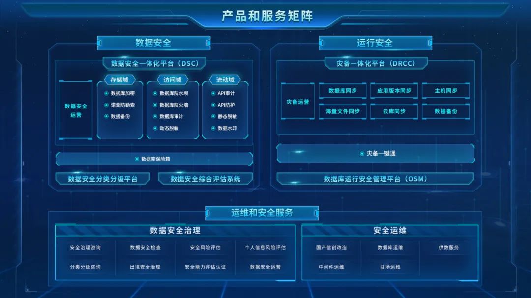 数据安全:数据库安全、数据备份与恢复、数据脱敏、文档安全、大数据保护、数据安全态势感知、数据分类分级、数据安全治理服务、数据安全评估和检查、个人信息保护