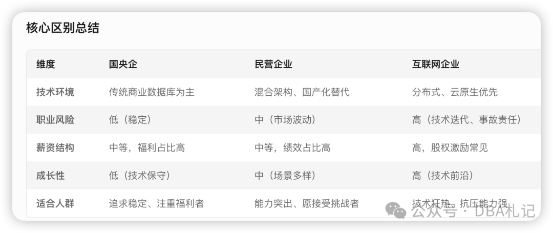• 国央企:适合偏好稳定、重视长期职业保障的DBA,但需主动学习新技术以避免技能脱节。