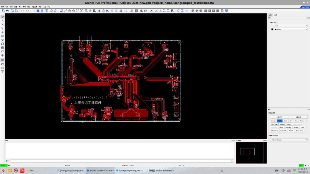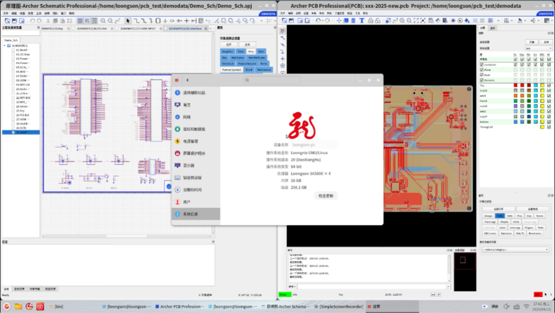 近日,龙芯3A5000/3A6000桌面终端与上海合见工业软件集团有限公司自主研发的PCB设计软件UniVista Archer成功适配,实现了电子系统设计平台从电子硬件设计工具到硬件研发平台的全国产化链路闭环。这一突破标志着龙芯终端在电子设计领域迈出关键一步,为“中国芯”的自主设计提供坚实底座。