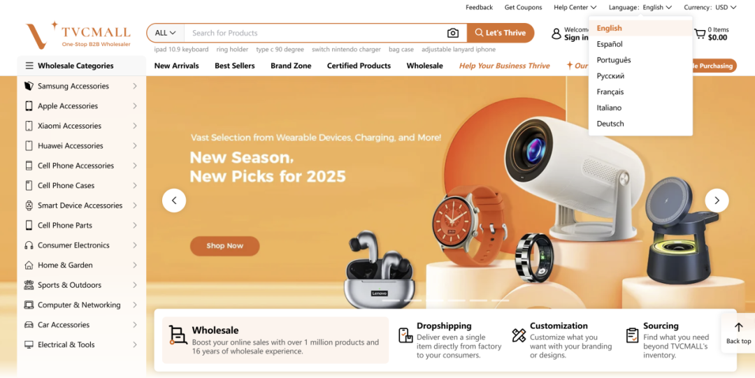 TVCMALL以手机配件为核心品类,同时根据客户需求逐步拓展了消费电子、家居庭院、户外运动、汽摩配件等品类,让全球客户体验到产品批发商优势和独立站服务优势相结合的创新体验。目前,TVCMALL平台支持英语、法语、德语、意大利语、西班牙语、葡萄牙语和中文等众多语言版本。