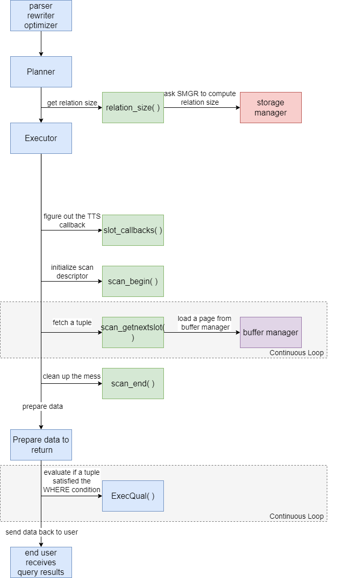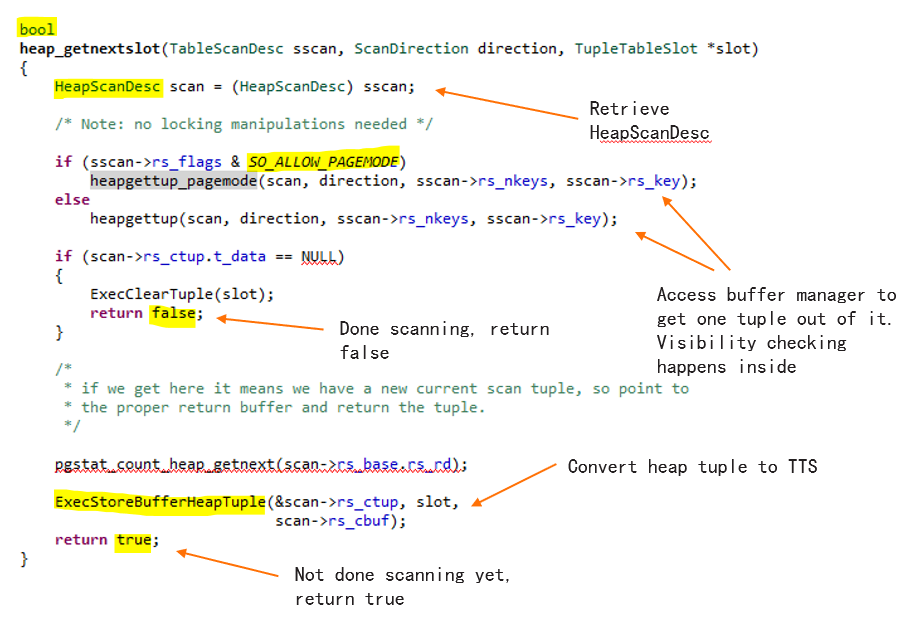 顺序扫描的核心。此函数负责从存储引擎检索元组。在 PostgreSQL 中,它会向缓冲区管理器(buffer manager)模块请求元组,该模块既可以从内存缓冲区读取元组,也可以从物理存储读取。