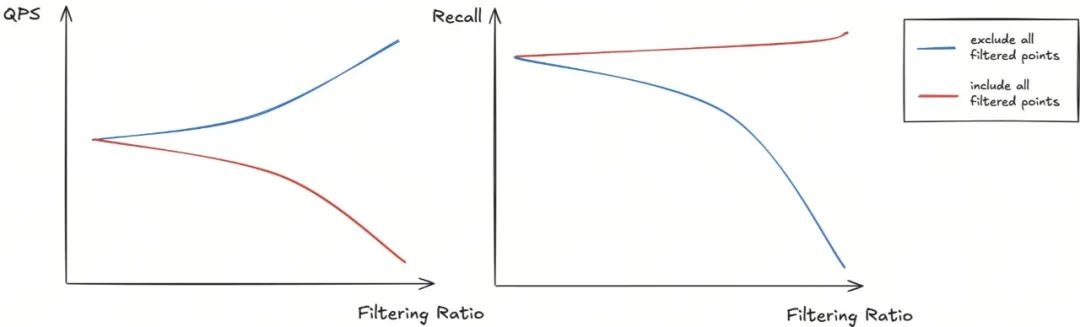 反过来,如果完全不跳过过滤掉的点,图遍历的成本就会显著增加,接近暴搜。可以把图索引想象成一个城市地图,查询点位于最南端,有效点都在北方。遍历路径就会导致我们要绕更多的路才能到达北方,检索过程中,还会不断向东西扩展,大大扩大搜索空间,降低系统吞吐(QPS)。