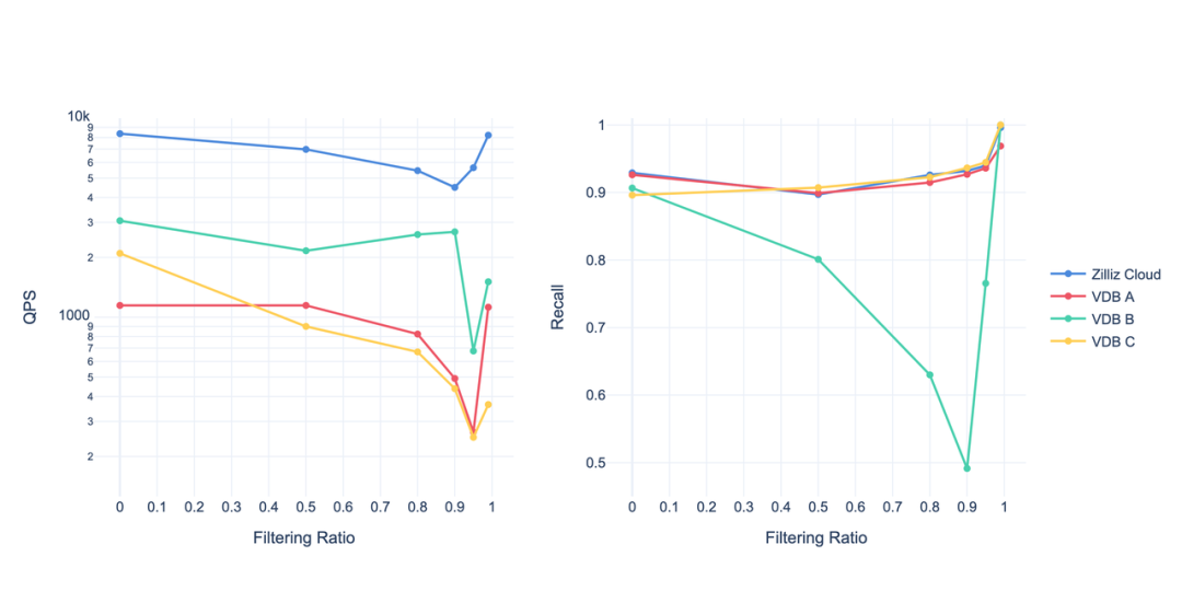 在有过滤和无过滤的多种场景下,Zilliz Cloud 在相同硬件资源条件下始终表现出最优的吞吐性能,展现出卓越的处理能力和性价比。