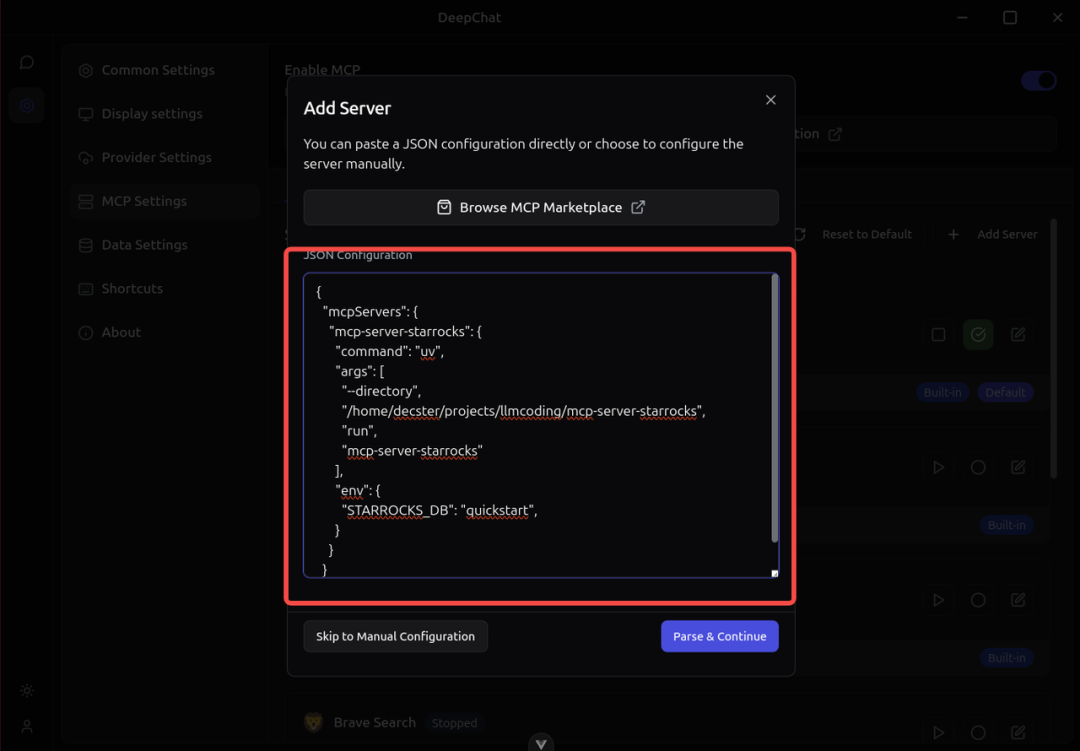 2.1 配置客户端添加 mcp-server-starrocks,客户端使用的是 DeepChat