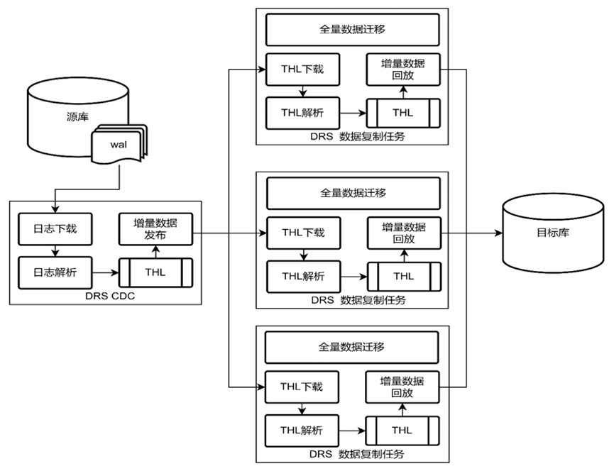 DRS支持CDC的数据迁移方案,即CDC通过拉取源库日志,解析成标准的THL格式文件,进行增量数据发布。DRS直接拉取THL文件,进行解析和过滤,实现增量数据回放,有效的降低了多个DRS任务直连源库对源库性能的影响。针对源库数据量级大需要拆分任务迁移(一对多场景),以及对源库性能敏感客户优先推荐使用该方案。