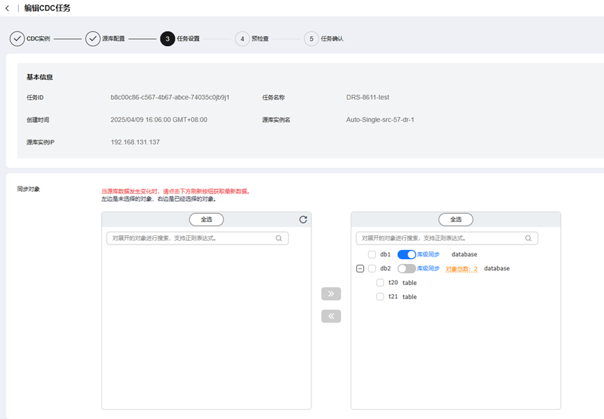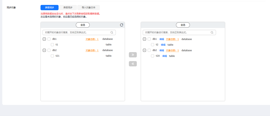 从实际业务需求出发,在CDC任务中提供2种对象选择方式:整库和部分表选择。通过对象选择,过滤冗余的源库日志数据,减少磁盘空间占用。