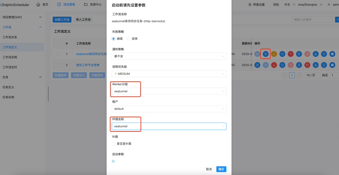 运行时候,选择seatunnel的worker分组和环境即可跑在这个集成了seatunnel的环境上