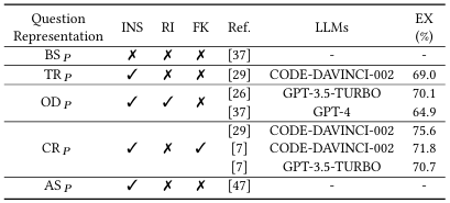 ):基本提示是一种简单的表示形式。它由表模式、前缀为“Q:”的自然语言问题和用于促使大语言模型生成SQL的响应前缀“A: SELECT”组成。在本文中将其命名为基本提示。