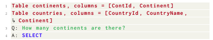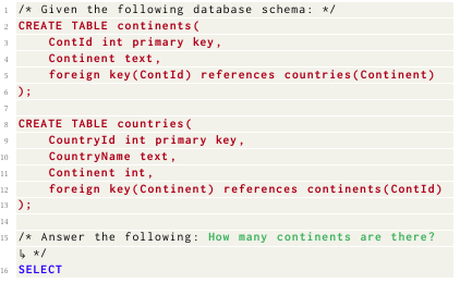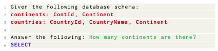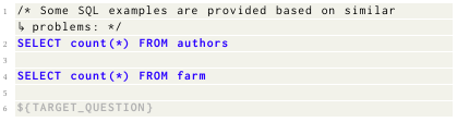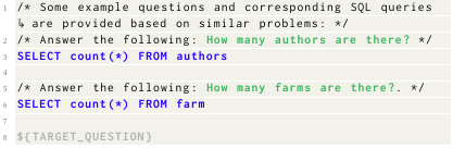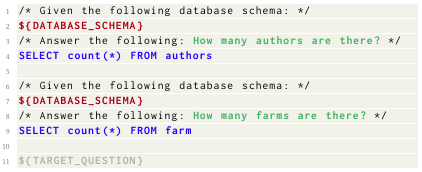 在提示中仅包含选定示例的SQL查询,并带有一个前缀指。这种组织方式在有限的词元长度内最大化示例的数量,但是删除了问题与相应SQL查询之间的映射信息。