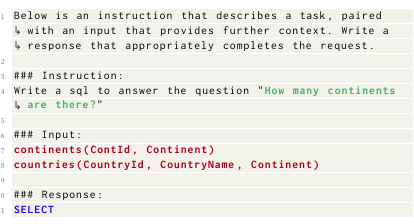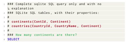 ):OpenAI演示提示由指令、表模式和问题组成,所有信息都用井号“#”注释。与文本表示提示相比,OpenAI演示提示中的指令更具体,并且包含一条规则:“仅完成sqlite SQL查询,无任何解释”。