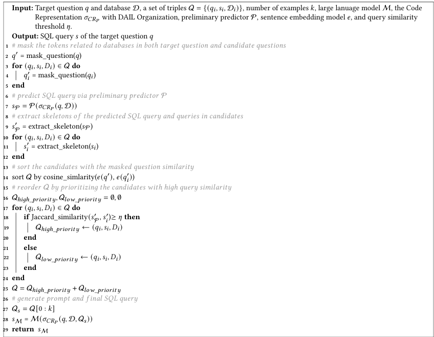 为了解决上述示例选择和组织中存在的问题,本文提出了一种新颖的Text-to-SQL方法,名为DAIL-SQL。