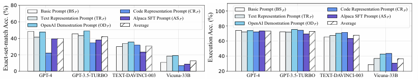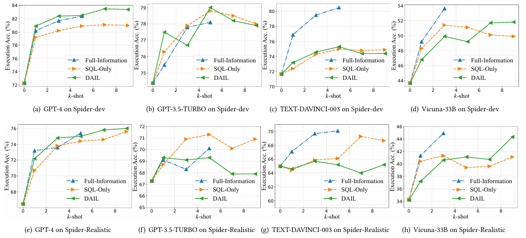 ● 在Vicuna-33B的情况下,DAIL组织优于仅SQL组织,但仍不及完整信息组织的性能。