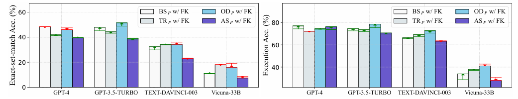 在零样本场景中,与规则暗示相比,带有外键的提示通常以更多的词元为代价实现更高的执行准确率。