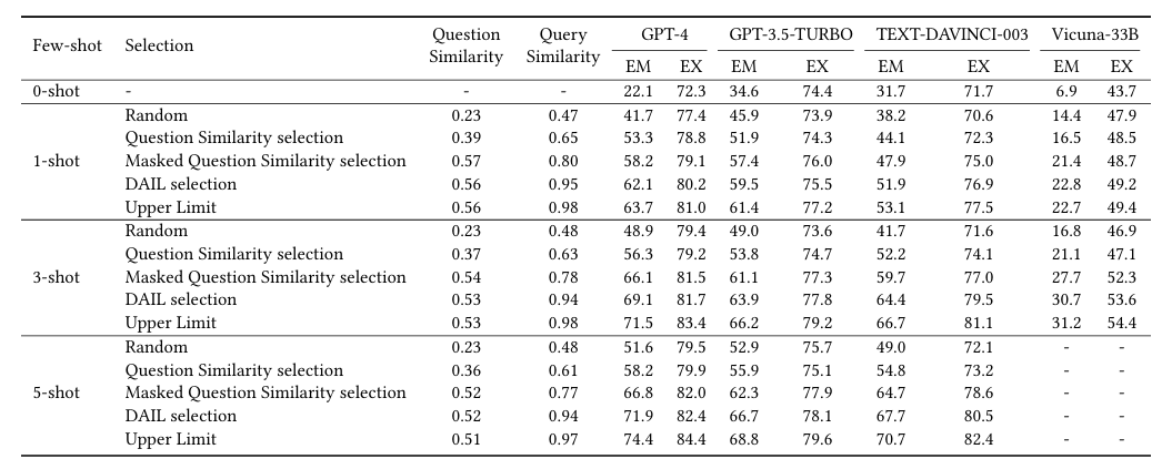 3. 在示例组织方面:对强大的大语言模型(GPT-4)呈现问题和SQL查询对是一种有效且高效的选择。否则,建议对其呈现完整信息的示例。