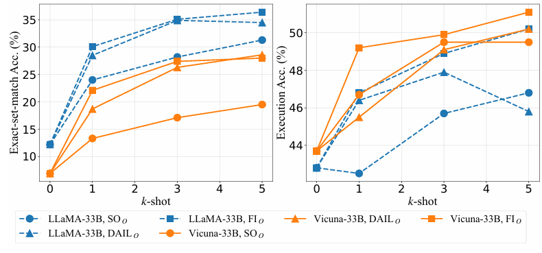 从图中可以看出,LLaMA-33B比Vicuna-33B受益更多,在5样本完整信息组织示例下,达到了36.4%的精确集匹配准确率。关于执行匹配准确率,在大多数情况下,增加示例数量对Text-to-SQL任务有益。此外,在不同的组织策略中,完整信息组织在不同的k样本场景中表现优于其他策略。
