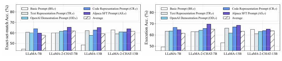 为了进一步提升开源大语言模型的性能,作者首先使用不同的表示方法,在零样本训练样本上对开源大语言模型进行微调。遵循监督微调的设置,实验阻止提示的梯度传播,仅使用响应(SQL查询)的梯度来更新权重。