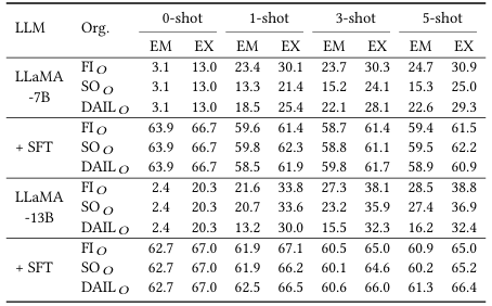综上所述,开源大语言模型在Text-to-SQL任务中显示出显著的潜力,特别是在监督微调方面。微调后它们的性能在零样本场景中与TEXT-DAVINCI-003相当。然而,微调后的大语言模型无法从上下文示例中学习。微调后如何保持上下文学习能力仍是未来研究有待探索的问题。