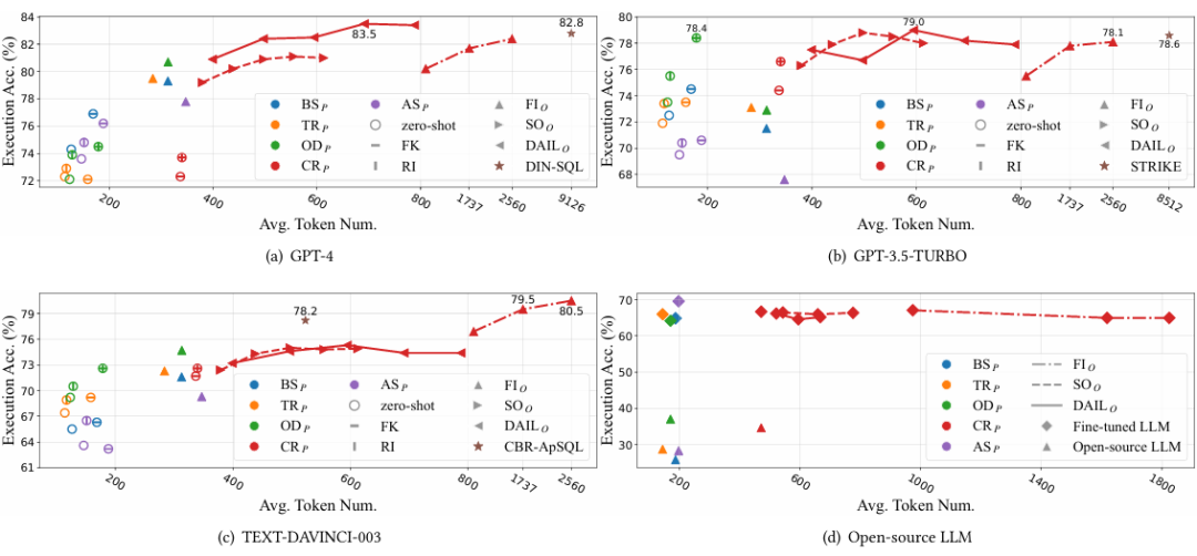 此外,对于图(d)中的开源大语言模型,在Text-to-SQL上进行微调的大语言模型效率要高得多。词元效率是大语言模型在Text-to-SQL实际应用中的一个关键指标。DAIL-SQL提供了一个有吸引力的解决方案,它结合了高执行准确率和更高的词元效率,使其非常实用且适合实际应用。