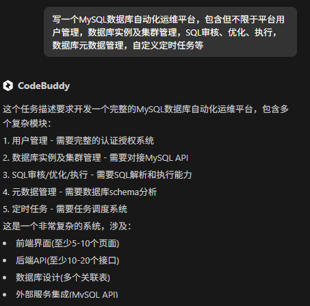 4.2 利用 CodeBuddy 生成连接代码如果写入的需求比较大,CodeBuddy会自动拆解,并建议你选择一个需求实现,例如:我输入的是“写一个MySQL数据库自动化运维平台,包含但不限于平台用户管理,数据库实例及集群管理,SQL审核、优化、执行,数据库元数据管理,自定义定时任务等”