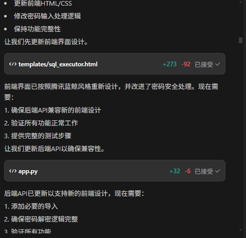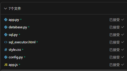 目录已成功创建,结构如下:api/templates/static/css/接下来需要创建5个核心文件:1. app.py - 主应用入口2. database.py - 数据库连接模块3. api/sql.py - SQL执行API4. templates/sql_executor.html - 前端界面5. static/css/style.css - 基础样式首先创建app.py作为Flask应用入口,包含基本路由和配置。app.py+34 -0已接受app.py 已成功创建,接下来需要创建 database.py 文件,包含 MySQL 连接和执行 SQL 的核心功能。该文件需要实现:1. MySQL 连接管理2. SQL 执行功能3. 结果集格式化4. 错误处理使用 pymysql 作为 MySQL 驱动,这是 Python 中最常用的 MySQL 客户端库之一。database.py+57 -0已接受database.py 已成功创建,接下来需要创建 SQL 执行 API 端点文件 api/sql.py。这个文件将:1. 提供更详细的 SQL 执行接口2. 添加输入验证3. 支持批量 SQL 执行4. 添加执行时间统计我们将保持与主应用相同的错误处理风格,并添加更多功能细节。api/sql.py+43 -0已接受API 端点文件已创建,现在需要创建前端界面 templates/sql_executor.html。这个 HTML 文件需要包含:1. SQL 输入文本框2. 执行按钮3. 结果显示区域4. 基本的错误处理显示5. 加载状态指示器我们将使用简单的 Bootstrap 样式,并通过 jQuery 进行 AJAX 调用。templates/sql_executor.html+107 -0已接受前端界面已创建,现在需要添加基本的CSS样式到static/css/style.css。这个样式文件将:1. 设置基本的页面布局2. 美化SQL输入框3. 调整结果表格样式4. 添加响应式设计5. 设置加载动画效果static/css/style.css+89 -0已接受所有必要文件已创建完成,现在需要:1. 检查项目结构是否完整2. 确认所有文件已正确写入3. 准备启动应用的命令4. 提供使用说明项目结构应包含:app.py (主应用)database.py (数据库连接)api/sql.py (API端点)templates/sql_executor.html (前端界面)static/css/style.css (样式表)接下来将提供启动应用的命令和初始使用说明。MySQL SQL执行器已成功创建,包含以下功能:1. 核心功能支持执行任意SELECT查询语句支持INSERT/UPDATE/DELETE等DML操作显示执行时间和影响行数基本的SQL注入防护2. 项目结构d:\python_dev/ ├── app.py # 主应用入口 ├── database.py # MySQL连接器 ├── api/ │ └── sql.py # SQL执行API ├── templates/ │ └── sql_executor.html # 前端界面 └── static/ └── css/ └── style.css # 样式表3. 启动步骤# 安装依赖 pip install flask pymysql # 设置环境变量(可选) export MYSQL_HOST=localhost export MYSQL_USER=root export MYSQL_PASSWORD=yourpassword export MYSQL_DATABASE=test # 启动应用 python app.py4. 使用说明访问 http://localhost:5000在文本框中输入SQL语句点击"执行"按钮查看结果查询结果会以表格形式展示非查询操作会显示影响行数5. 注意事项确保MySQL服务已启动默认使用test数据库如需修改配置,可编辑app.py或设置环境变量生产环境请勿使用debug模式