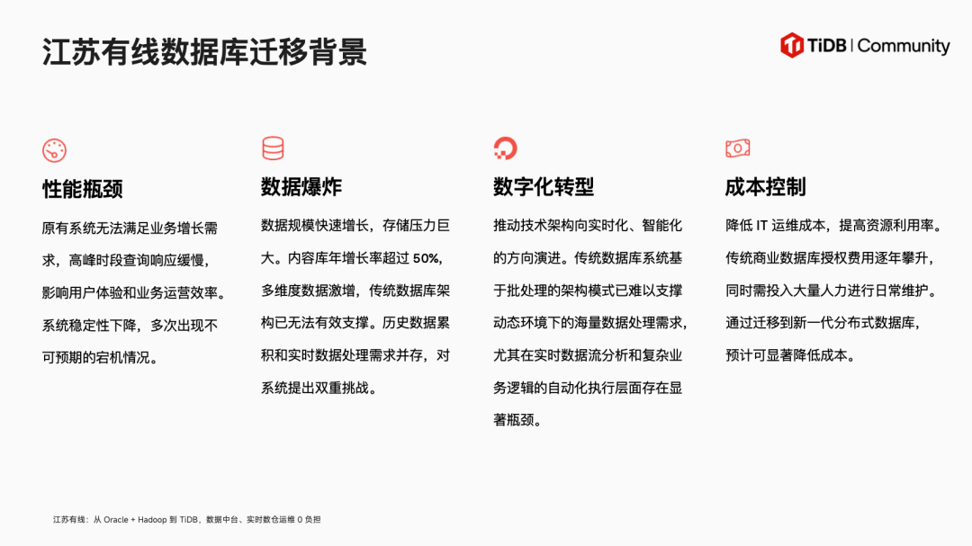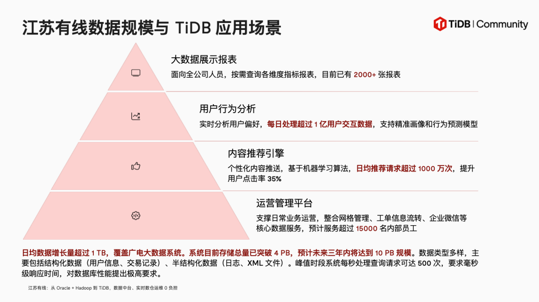 传统媒体行业的数字化转型浪潮进行时,江苏有线作为国内领先的省级广电网络集团,在 2022 年启动了系统数据库国产化替代试点测试,其从传统 Oracle + Hadoop 架构向国产分布式数据库 TiDB 的转型历程,为未来的智能化发展奠定了坚实基础。本文将基于江苏有线大数据开发工程师刘杰老师在 TiDB 南京站地区活动中的分享,为传媒行业数据库国产化及运维之路提供经验参考,助力传媒行业技术革新。