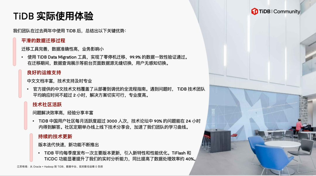在过去两年使用 TiDB 的过程中,江苏有线大数据开发团队对 TiDB 的优势有了更加深刻的感知。TiDB 完全兼容 MySQL 协议,大大降低了技术切换的风险和成本。同时,活跃的社区和专业的技术支持团队,也为江苏有线的数据库稳定运行提供了可靠保障。最初在实际迁移过程中,江苏有线采用了分阶段实施的策略。在数据迁移的过程中,使用 TiDB Data Migration 工具实现了 99.9% 的数据一致性验证通过率,整个过程做到了业务无感知的平滑过渡。