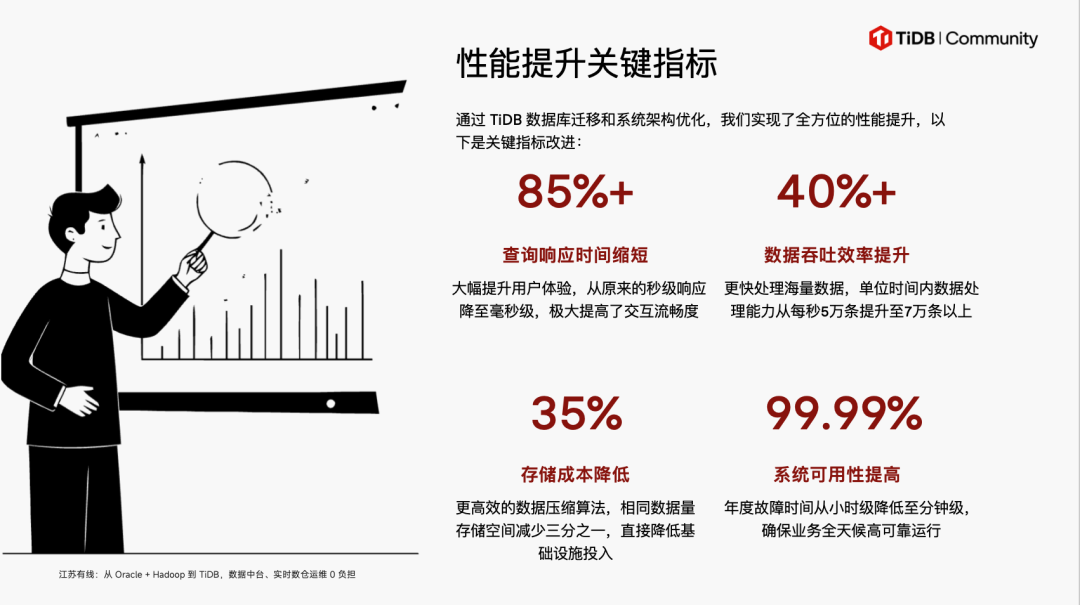 同时,江苏有线通过 TiDB 数据库迁移和系统架构优化,实现了全方位的性能提升及显著效益:
