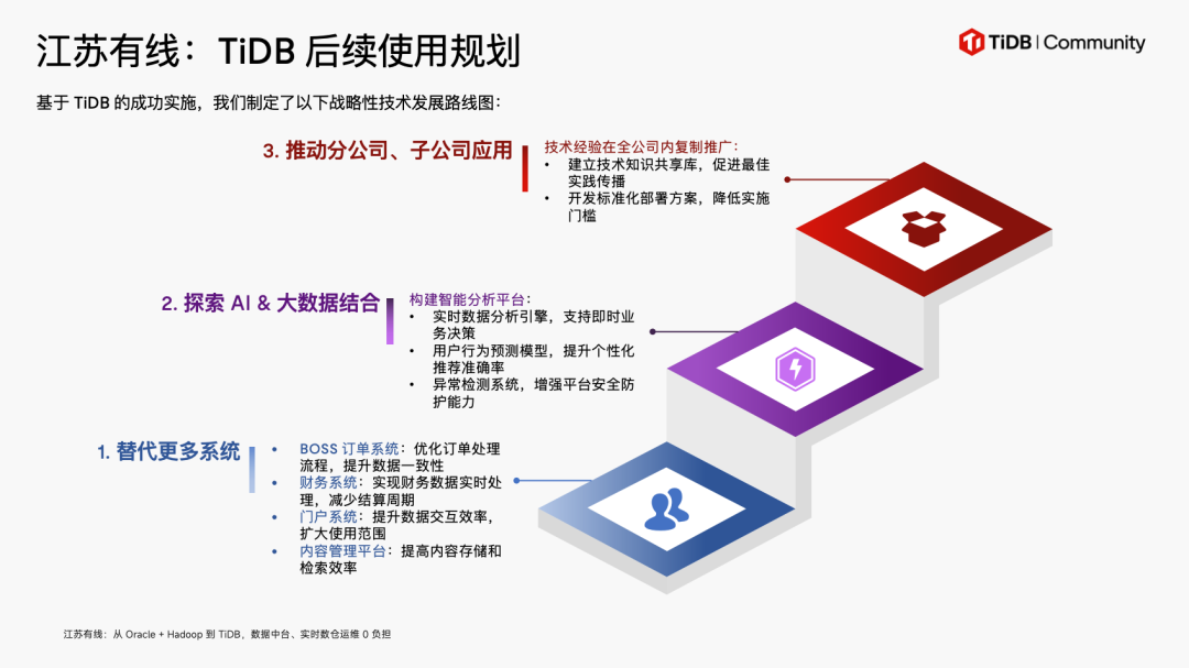 基于 TiDB 的成功部署,江苏有线已经制定了更长远的技术发展规划。下一步将推动 TiDB 在更多核心系统的应用的测试,包括 BOSS 订单系统、财务系统等,实现全业务数据的统一管理。同时,积极探索与 AI 技术的结合,构建智能分析平台,开发用户行为预测模型和异常检测系统。