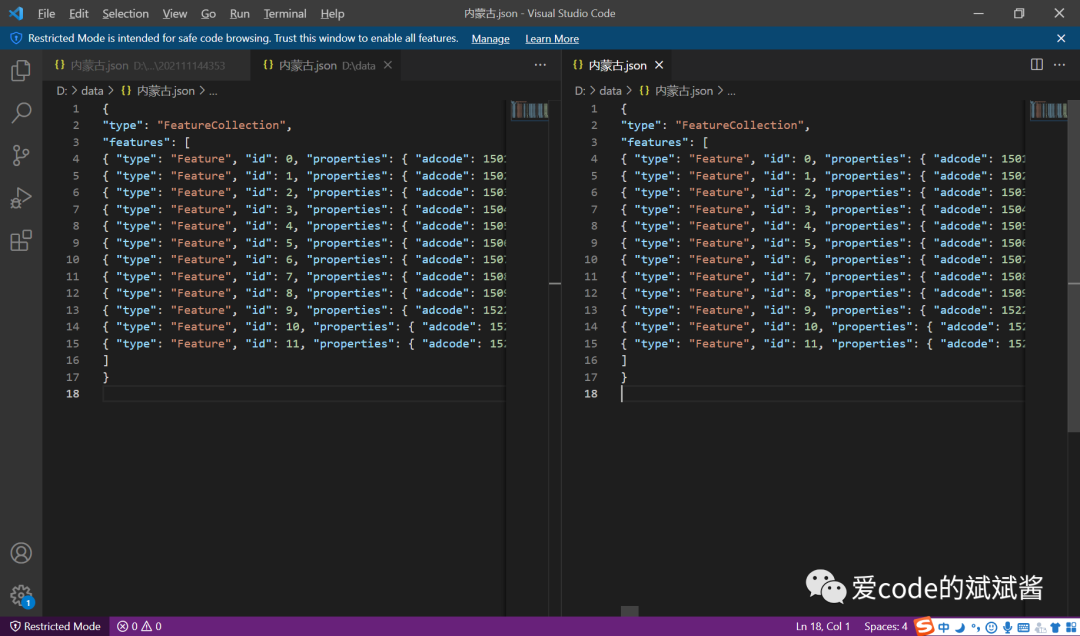 现在我们在VScode里面对照一下,我们最初下载的内蒙古.geojson和反向生成的是否一样。
