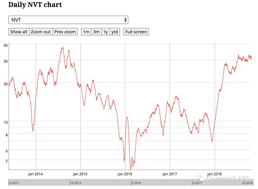 理解加密资产估值的最基本比率之一是网络价值比交易量。该比率用网络价值(network value),即这些资产的市值,除以交易量(network transactions)。通过这个比率,我们希望看到整个网络的价值与该网络中的活动是否存在关联。这个比率我们称之为“加密货币的P/E比率”,因为它是确定基本价值的最基本指标之一。如果一个加密资产的网络价值(即市值)很高而网络活动总量很低,那么这个加密资产具有较高的NVT比率。如果这个加密资产具有中等的网络价值而网络活动总量很高,那么这个加密资产的NVT比率较低。我们用梅特卡夫定律和网络效应分析网络活动时,较低的NVT比率表明可能存在升值空间。