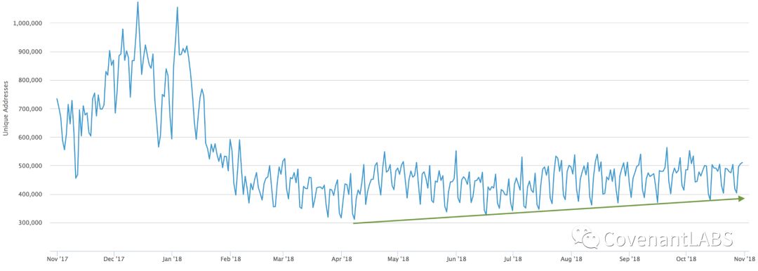 在下图中可以看到,趋势在2018年8月开始上升。似乎需求和网络活动的数量都在,而且趋势似乎正在上升。此时看涨比特币。