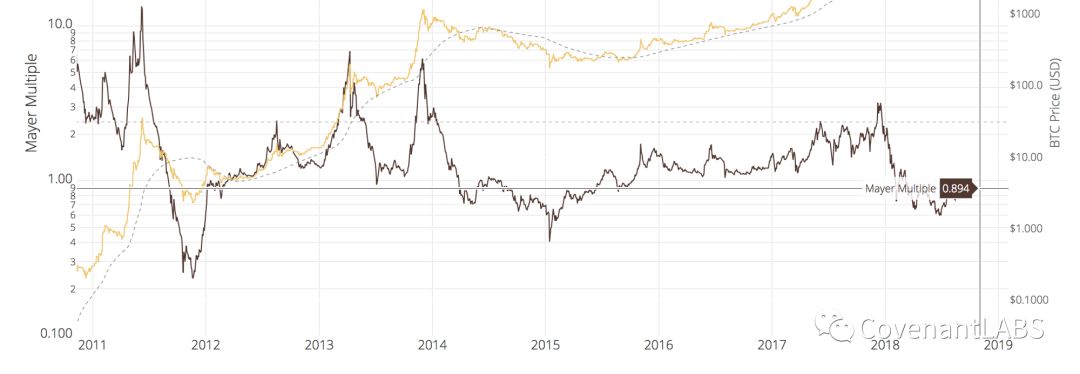 Mayer Multiple是继NVT比率之后比较成熟的比率之一。它以Trace Mayer命名。Trace Mayer是比特币最早的投资者和分析师之一。Mayer倍数是一个基于统计的估算值。它使用200天移动平均线 (200-day moving average) 并显示了价格与历史交易价的的相关程度。简单地讲,Mayer倍数公式如下:
