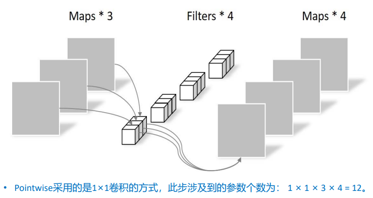 PW采用M个1×1卷积,来创建深度层的线性组合。点卷积的计算量和参数量为: