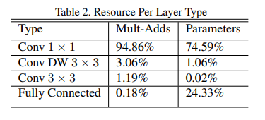 MobileNet将其95%的计算时间花费在1×1卷积中,其中也包含75%的参数。几乎所有其他参数都位于全连接的层中。