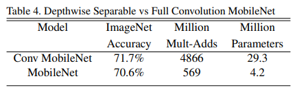 可以看到与标准卷积相比,基于深度可分离卷积构建的MobileNet只在精度上降低了1%,但是计算量和参数量降低了一个数量级。