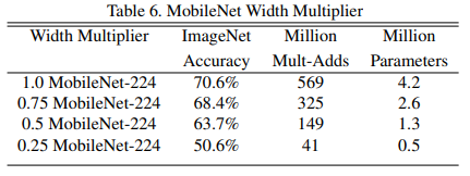 尽管采用深度可分离卷积的MobileNets已经足够小且延迟低,但是在很多应用条件下可能依然会要求模型变得更小,响应速度更快。因此该篇文献又引入了一个宽度因子的超参数,来控制网络每一层的特征图的通道数(网络均匀变薄)。