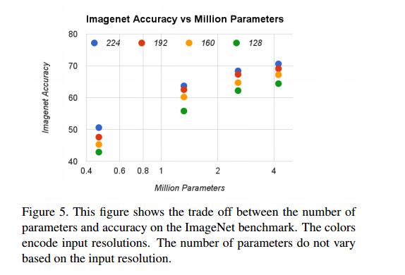 将减少后的MobileNet(宽度因子和降低后的分辨率)与AlexNet和Squeezenet进行比较,如下图所示。