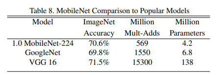 MobileNets的准确度几乎与VGG16一样,但是参数量小32倍,计算量小27倍。它比GoogLeNet更准确,但体积更小,计算量更少。