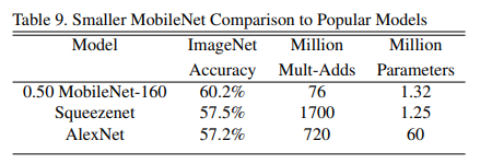 减少后的MobileNet比AlexNet好4%,而计算量却比AlexNet小45倍,少9.4 倍。在大约相同的大小和22倍以下的计算量下,它也比Squeezenet好4%。