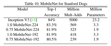 将不同变种的MobileNets在Stanford Dogs dataset进行训练和测试,首先从网络上收集了大规模的嘈杂的训练集来预训练细粒度的狗识别模型,然后在斯坦福狗训练集中对模型进行微调,在Stanford Dogs测试集的结果如下表所示。